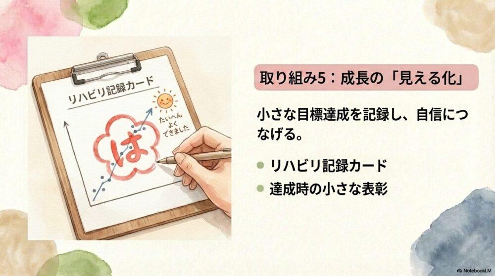 - リハビリの成果を「記録カード」に書き込み、目に見える形で進歩を実感してもらう。